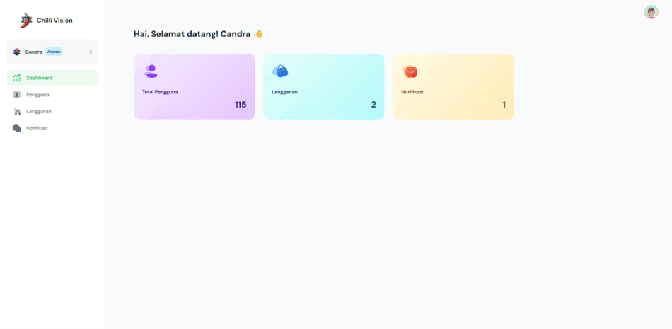 Chilli Vision Web Admin adalah platform berbasis web yang dirancang untuk memudahkan pengelolaan konten, pengaturan subscription, dan distribusi informasi ke pengguna Chilli Vision Mobile. Frontend dibangun dengan template Next.js dan TypeScript agar tampilan responsif dan interaktif, sementara backend menggunakan Laravel untuk manajemen data, autentikasi, dan integrasi modul. Dengan sistem ini, admin dapat memonitor aktivitas pengguna, memperbarui konten, serta memberikan pengalaman digital yang lebih terstruktur dan mudah diakses bagi seluruh pengguna.
