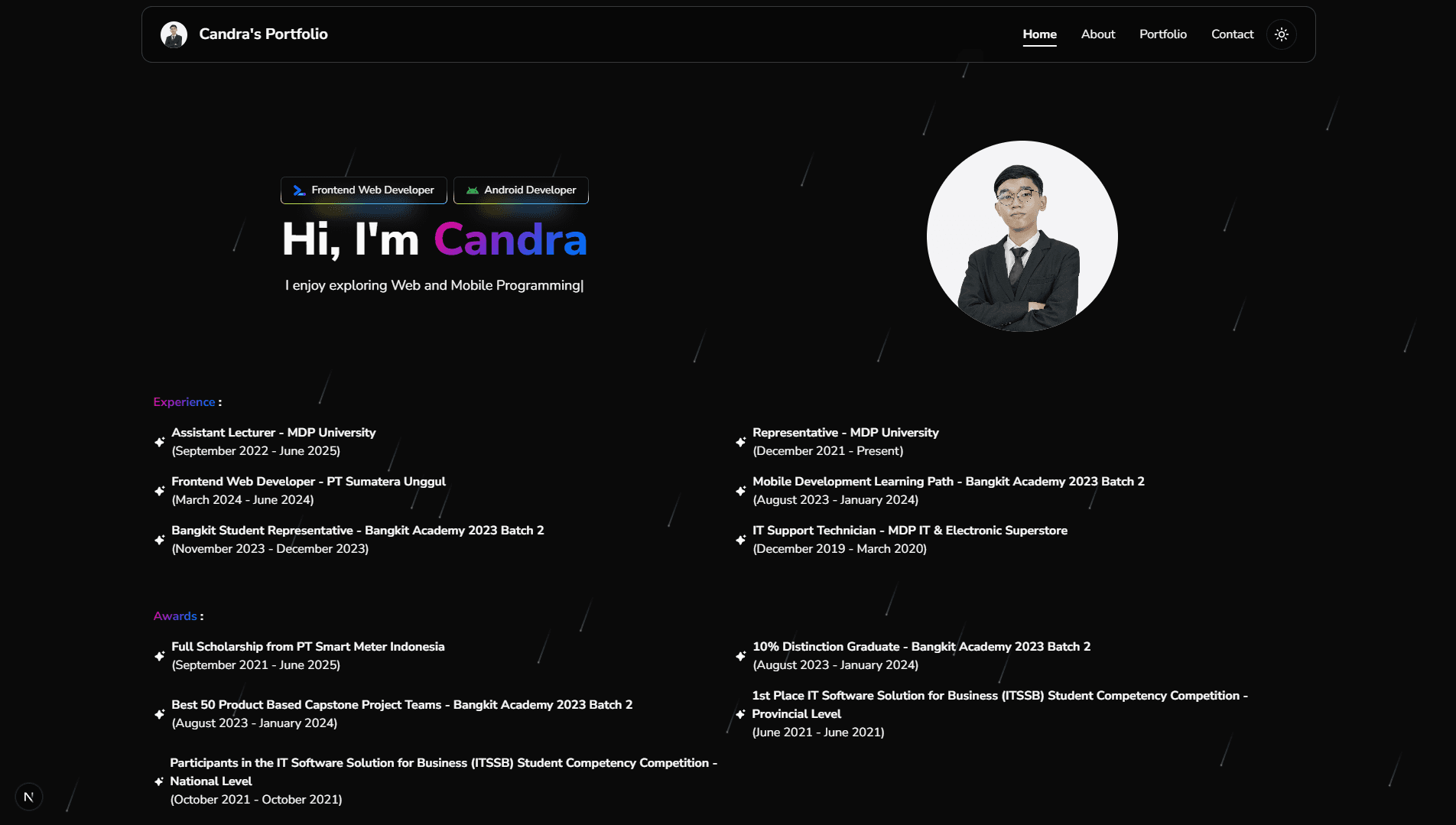 Web portfolio adalah platform berbasis web yang berisi kumpulan proyek yang telah saya kembangkan, baik secara individu maupun bersama tim. Sebagian besar karya yang saya hasilkan berupa aplikasi web dan aplikasi mobile. Dalam pengembangan web portfolio ini, saya memanfaatkan teknologi modern seperti Next.js, TypeScript, Tailwind CSS, Shadcn UI, dan Iconify untuk menghadirkan tampilan menarik sekaligus performa optimal. Portofolio ini tidak hanya menjadi dokumentasi hasil kerja, tetapi juga media untuk menampilkan perkembangan saya sebagai pengembang. Kedepannya, proyek baru akan terus diperbarui sebagai bagian dari perjalanan saya dalam membangun solusi digital di bidang web maupun mobile.