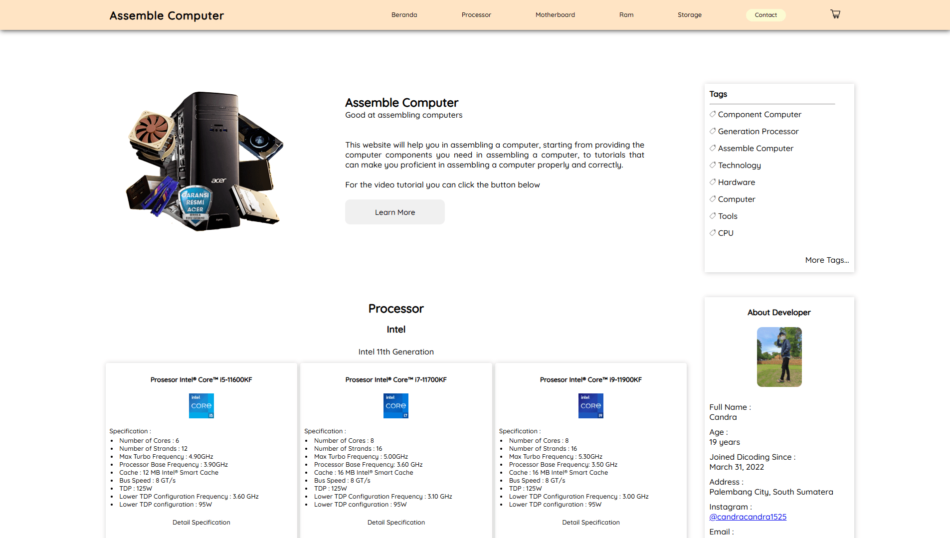 Rakit Komputer adalah proyek web yang dikembangkan sebagai Tugas Akhir Dicoding Web dengan tujuan memberikan informasi seputar perakitan komputer secara interaktif dan terstruktur. Aplikasi ini dibangun menggunakan HTML, CSS, dan JavaScript dengan menekankan pada implementasi standar dasar web modern dengan fokus pada semantik, responsivitas, dan kemudahan navigasi. Proyek ini mengasah keterampilan fundamental dalam pengembangan web, seperti pengaturan layout, manipulasi DOM, hingga optimalisasi tampilan. Rakit Komputer menjadi project web tahap awal saya dalam membangun aplikasi informatif.